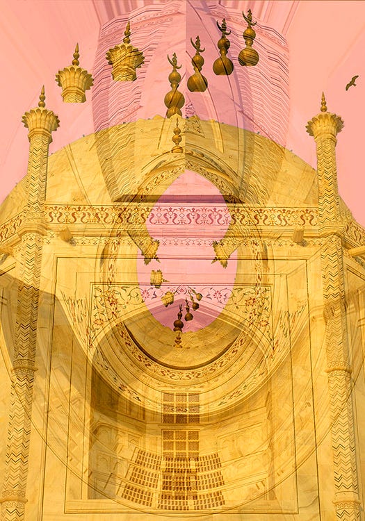 On the last afternoon of my first trip to India, I had gone to visit friends on the campus of Jawarhalal Nehru University, and found myself being followed by three young girls. I gave them a chocolate bar I had been keeping for the late night flight, and made an image of one of them. She had an elegant and solemn face for a twelve-year-old, and it’s her countenance that I later fused with the Taj, to make my Face of India, a Hindu child on a Muslim monument.