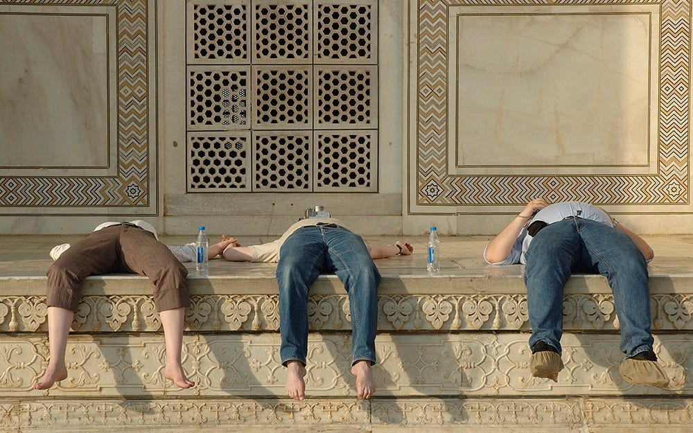 As it turned out, her work commitments prevented Karine from accompanying me, so I went alone and largely unschooled, except for what I managed to read in a guidebook. The first sight of the Taj Mahal was overwhelming, but I knew I could take my time, and do what I’ve always done, especially with an immobile subject: look, listen, feel, absorb, think, plan. Then interpret. Not that different from my portraiture of living, dynamic subjects, who enjoy the added benefit of conversation.