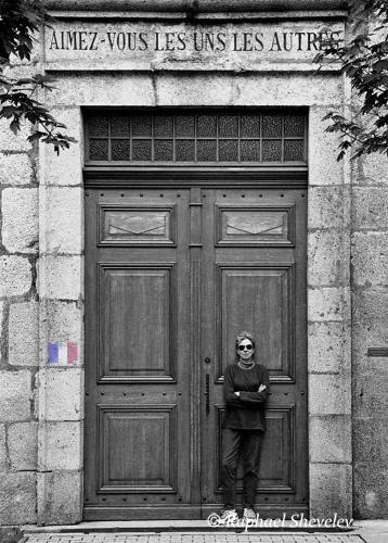 I made the accompanying picture of Karine there. The iconography is simple: a relaxed, confident, strong woman, raised in an atmosphere of deep commitment to human rights, before the unyielding square stone geometry of that particular Huguenot church with its heroic congregation. On her right, at face level, I added a worn, painted graffito of the bleu-blanc-rouge, the French flag. It is as worn and scuffed as was the honor of France during the war years. Le Chambon was the village that accomplished so much to rescue that honor.