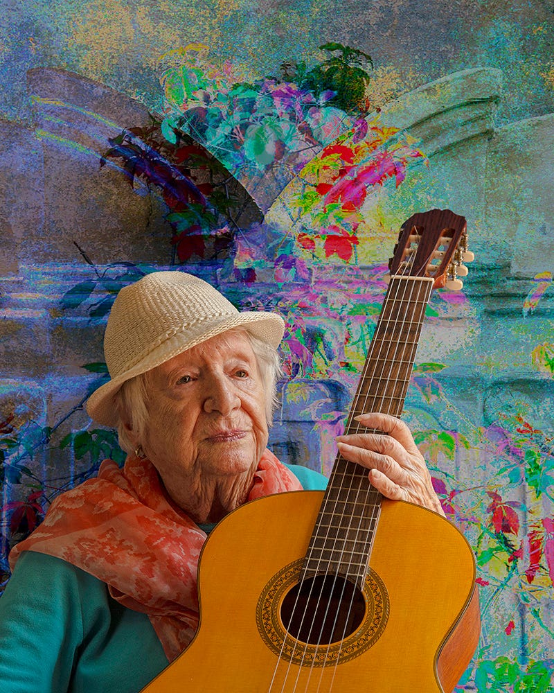 It has become possible to combine portions of images, some of which were made years ago, to enrich a final portrait. Here is one such example: Miriam at 100, the Melody Continues. The background is a repeated single image, made many years ago, fashioned into a combination of two images, mutually reversed in overlapping orientation and tonality to signify night and day, suggesting the passage of time, also inherent in the subject.