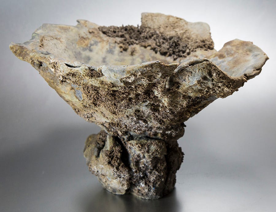 Some years ago, my wife brought me a gift from the studio of my favorite ceramicist, the renowned Catharine Hiersoux, who is also a neighbor. I was captivated by the design. Catharine’s products are usually smoothly elegant and subtly glazed. I have several examples. This was not. It was rough, craggy, almost, do I dare say it, unfinished, and therefore, a stimulant to my imagination. It wasn’t just a vase, so it might be something else, many other things.
