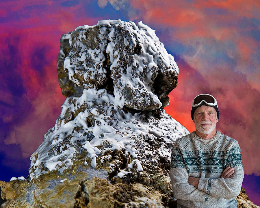 The last element was finding an appropriate human figure in the foreground. Among my friends is the prolific environmental author Kenneth Brower, son of the late David Brower, mountaineer, environmental advocate, former executive director of the Sierra Club, founder of Friends of the Earth. Ken also looked right: a handsome bearded gentleman, made even more right by wearing my favorite cold weather sweater, navy watch cap, and a pair of goggles borrowed from a neighbor. Ken’s face is never far from a warm smile, but I urged him to look fierce and determined, about to face his coming climbing ordeal.