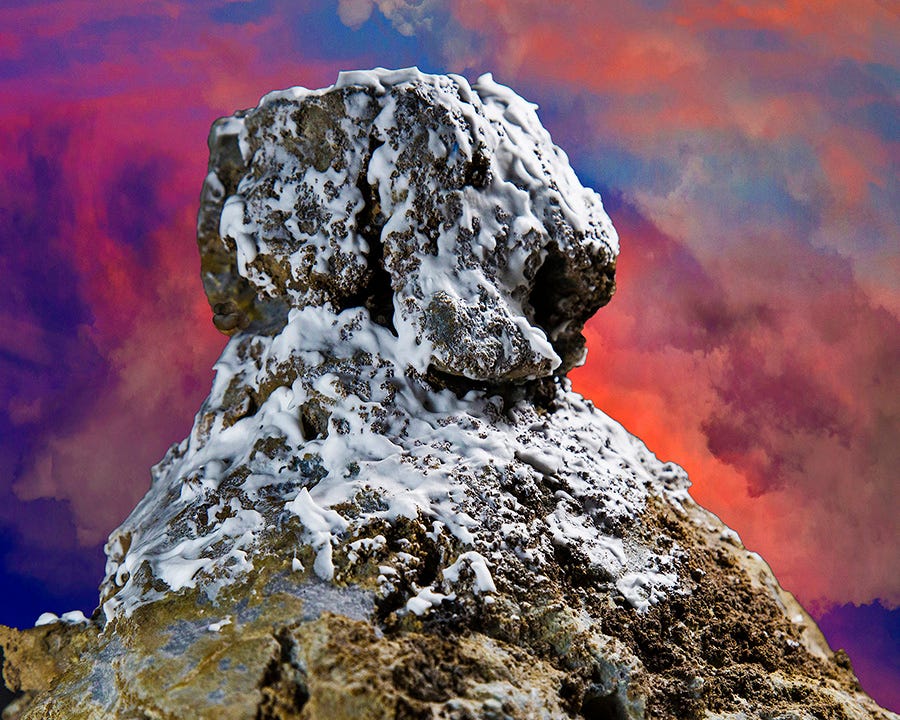 The next part of the process was finding an appropriate, dramatic sky background, rendered simple by the beautiful, color-saturated winter sunsets that illuminate the western windows of my home overlooking San Francisco Bay. Then came the need for a light snowfall on the upper reaches of Mt. Hiersoux. For that I’m grateful to the manufacturers of Gillette Foamy Shaving Cream (original flavor), which made unnecessary a trip to the Sierras in winter.
